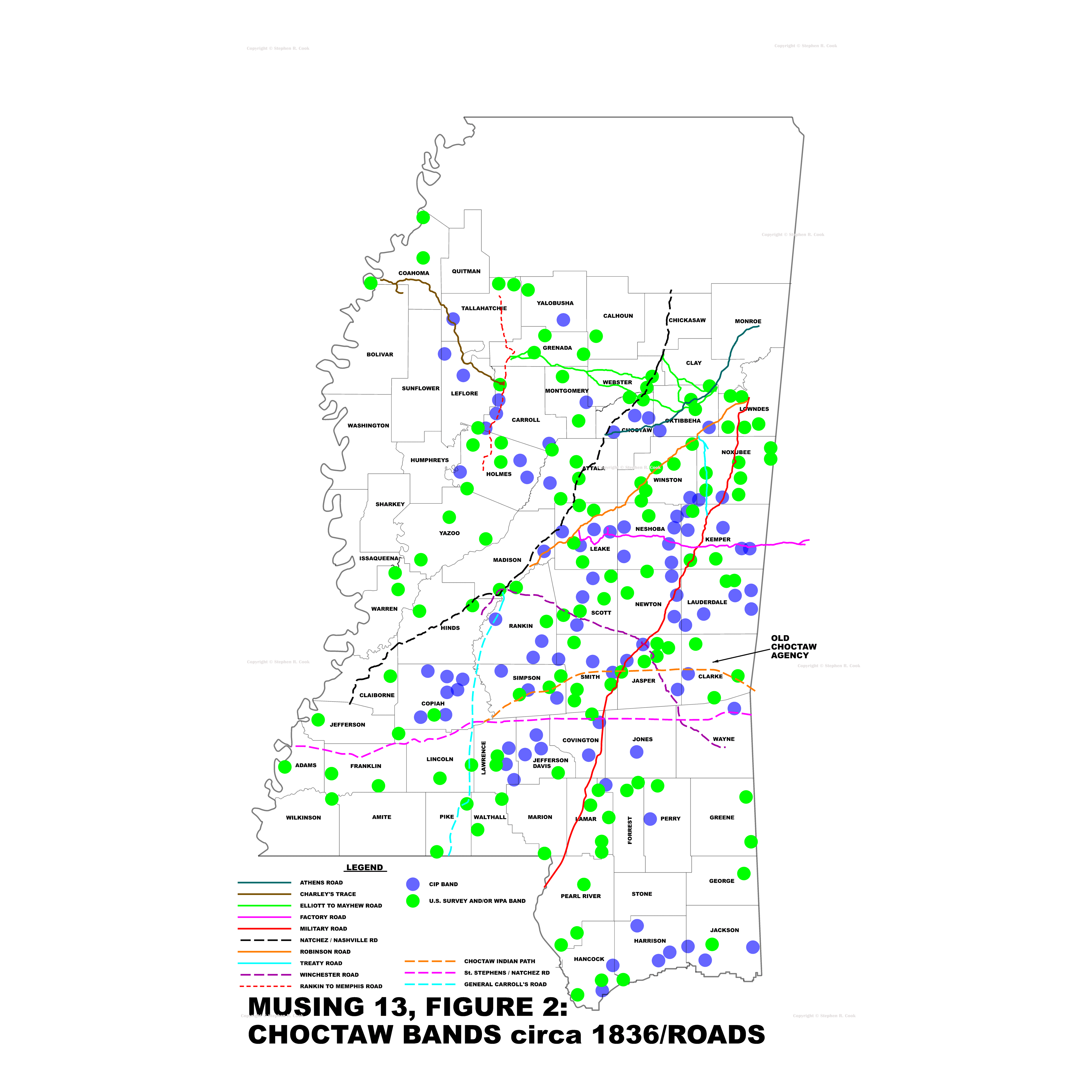 Click here for a larger view of Musing 13 Figure 2 - CHOCTAW BANDS circa 1836/ROADS.